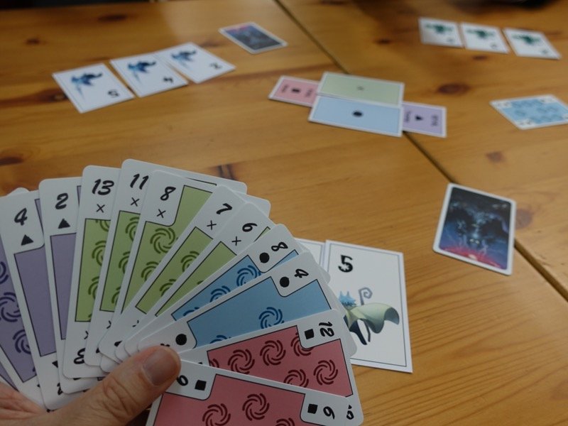 4人専用の協力トリックテイク。4スート14枚の割とスタンダードなデッキですが、各手札に付随して2、3、4、5の4枚のトリック数を示したビッドカードがあり、達成したトリック数に応じてビッドカードを除去できます。目的は4ディールで4枚全てのビッドカードを全員が除去することです。各ディールは14トリックなので、論理的には可能です。しかしメニューシステム(と勝手に呼んでいますが、「ミゼルカ」「多すぎる料理人」「ゴーゴーエスキモー」みたいに異なるメニューをこなして最後は選択肢がなくなるシステムのゲーム)なので難しいのです。