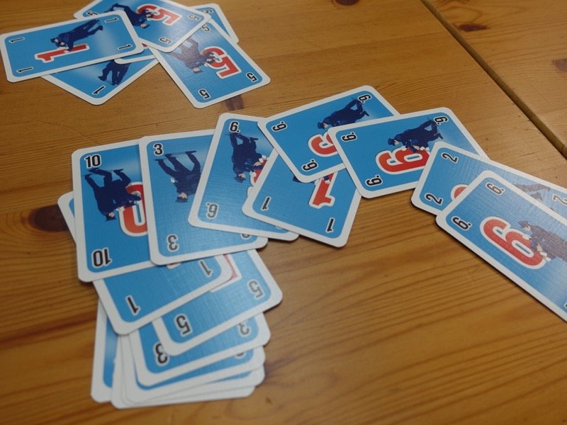 エッセン新作。ルールを読むと「シュミット21」のリメイクですがカード枚数が異なります。カード構成がよくできていて、4がなく、1、2、3、5、6、10の6種類しかありません。そして「シュミット21」ではそれぞれ10枚(10は5枚)で合計55枚だったのですが、「押し屋東京」ではそれぞれ12枚(10は6枚)で合計66枚になっています。おそらくベストは2−3人です。ということで、今回は3人で3回遊びました。