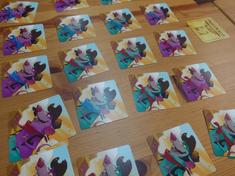 ネズミが似ていてなかなか区別をするのが難しく、偽物を指差してしまうことも多かったです。そんな中、ピザさんが2連勝して勝利。なお、拡張カードが1枚あり、どのネズミがお尋ね者かを示せるようになっているのですが、今回は使うのを忘れました。