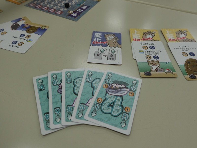 ここで4人になり、再び林尚志氏のゲームとして「すしオッター」を遊びました。カワウソが寿司を握っているイラストが可愛いゲームです。手札8枚から最大5枚のポーカーハンドを作っていき、各ハンドにはスコアと勝利点があります。この用語が非常に紛らわしいのですが、スコアはカードの金貨などによって足されることもあり、スコアが最も高いプレイヤーから順位点として勝利点がつきます。また自分だけの手役など、様々な特殊カードがあるあたりは、おかずブランドっぽいなあと思います。自分は序盤に手に入れたイーブンフラッシュ(すべて同スートで数値が偶数)という役を2回作ったのですが、3回目がうまくいかずに沈んでしまいました。