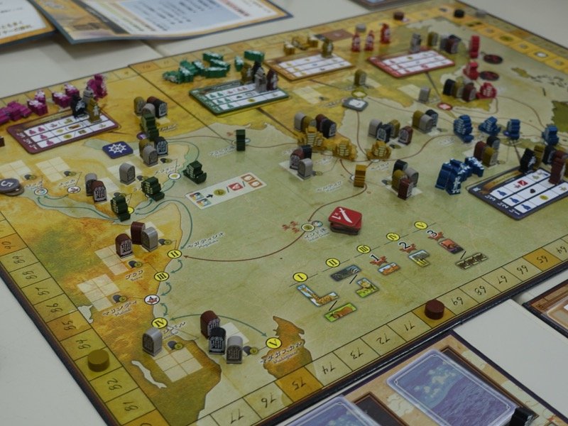 ハンスイムグリュック出版の「チグリスユーフラテス」初版です。今回は中盤まであまりモニュメントが建たない展開で、自分はピーカンさんと小競り合いをしているうちに置いていかれました。幾多の戦争ではいつもタイルが1枚足りずに負けてしまうという悪循環が続き、最下位でした。それでもやっぱり傑作だと思います。途中で何度かタイルを捨てて手札をリフレッシュした方が良かったですね。