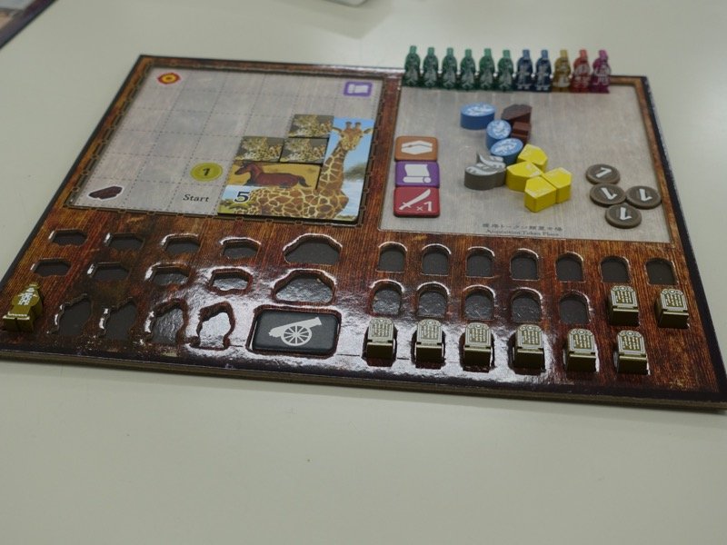 遠方のアフリカやマダガスカルに行くと動物を持って帰れます。そして動物タイルでポリオミノパズルをします。また戦いという要素があり、貢献度によって色々な資源や点数や何かがもらえます。