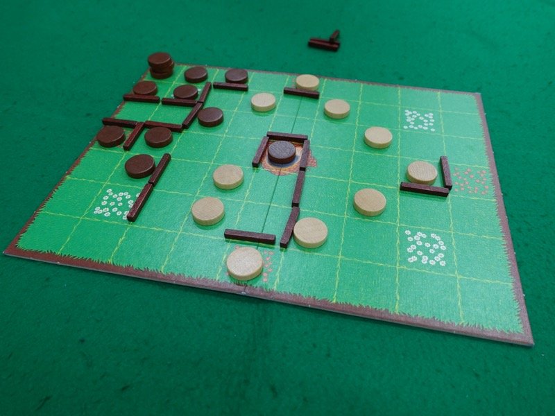1戦目は経験もあって自分が勝ちましたが、2戦目はかなり接戦。完全情報ゲームなので、最善手がありそうですが、それがよくわからないのはこのゲームの魅力です。中央の穴や周囲の花を巡る駆け引きが良いですね。