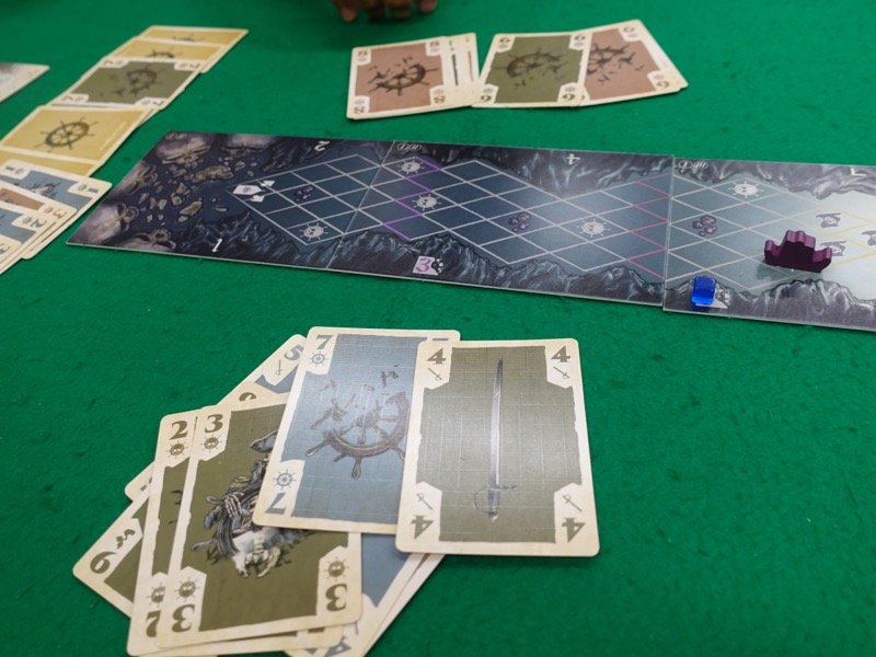 トリックテイクの協力ゲームです。キャプテン以外はとらなければならないトリック数がカードで決められますが、そのカードは本人だけは見ることはできません。なので危ないと思ったら時間を巻き戻してやり直すことができるのです。自分はルールを勘違いしていて、決められたトリック数以下なら良いと思っていましたが、ちょうでないと成功にはならないようですね。ちょっと「ディ・クルー」の簡易版みたいだね、という意見がありました。