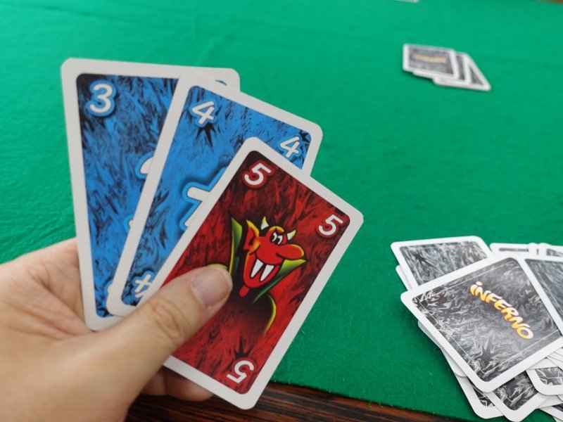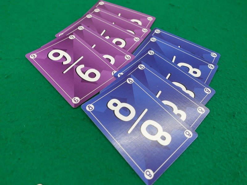 プレイ感覚が「スパイ」や「バンパイア」に似ていると思っていたら、シャハトの「ドライブ」をアレンジしたもののようです。カード枚数が多いほど、相手のカードを更新しやすいのですが、点数は、使われたカード全てに書かれた点数のうちで一番低いものになるのがなかなか難しいところです。カード枚数やカードの点数に規則性がないので、戦略的に遊びづらいのは難点かもしれません。