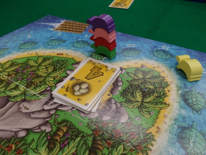 「冷たい料理の熱い戦い」のリメイクの「ウミガメの島」の7人プレイです。7人でも遊べるようになっているのは良いですね。ちょうど21番目のマスに辿り着くと2枚もらえるというルールはオプションになっていましたが、取り入れて遊びました。