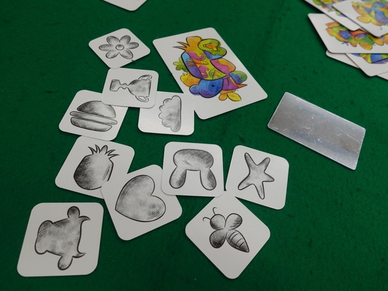最後はusalapbitさんが持ち込んだフランスのゲーム「ミラーマジック」です。与えられたカードの絵を自分のカードのどこかから探すのですが、線対称の半分しか描かれていません。手持ちの鏡を立てて鏡像を使って線対称の絵を完成させます。