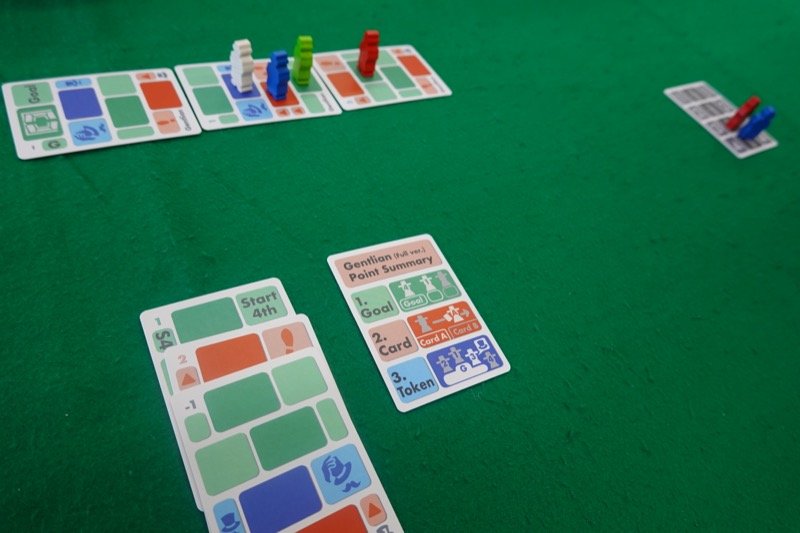 2回目です。完全公開情報の双六という試みなのですが、結構よくできています。自分以外の前の手番の他プレイヤーのコマも進められるというのが面白いし、他プレイヤーのコマを進めると帽子をかぶるので、その間は他プレイヤーを進められなくなる代わりに自分も他プレイヤーから邪魔されなくなるという諸刃の剣っぽいところもあります。