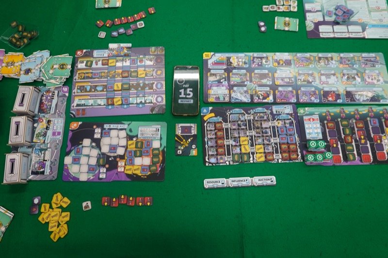 今回は戦闘(インベーダー)に割と力を入れていました。惑星探索では僅差で3位となってしまったりと、色々な箇所で僅差で得点にならない無駄な手が多かったと思います。競りでちょっとエキサイトし過ぎたところもあります。順当に適正価格で競り落としたと思われる武井さんの勝利。