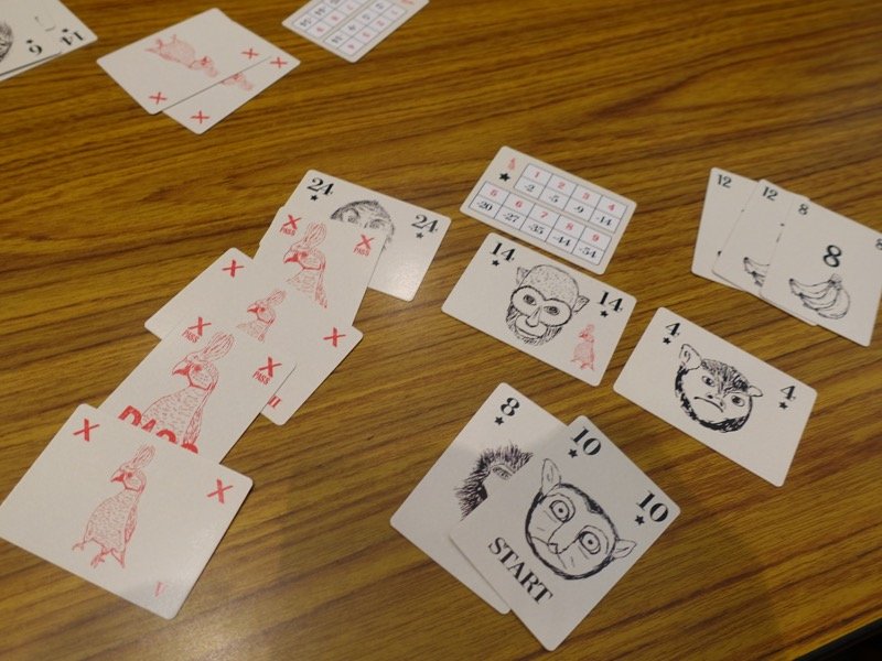 バナナと猿を題材にした競ゲームです。まずは通貨に当たるバナナをドラフトしますが、方法がかなり変わっています。配られたカードをソートせずにそのままで、仕切りとなるカードを挟んでいくのです。そして時計回りにカードを回して、回ってきたカードで仕切りから仕切りの間のカードのセットを選ぶというわけです。ケーキの切り分け問題とブースタードラフト方式が組み合わさっています。