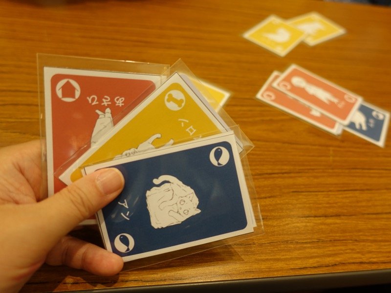 以前、ミスボド本厚木で試遊したゲーム。そのときとはルールが少し変更されており、改良されています。3色のカードだけを使ったシェディング系(ゴーアウト系)ゲームです。同枚数でこれまで出ていない色を出すか、直前の色と同色で1枚増やして出すかができます。3枚になると3色3枚という組み合わせも出すことが出来、これはラウンドを終了させる働きがあります。