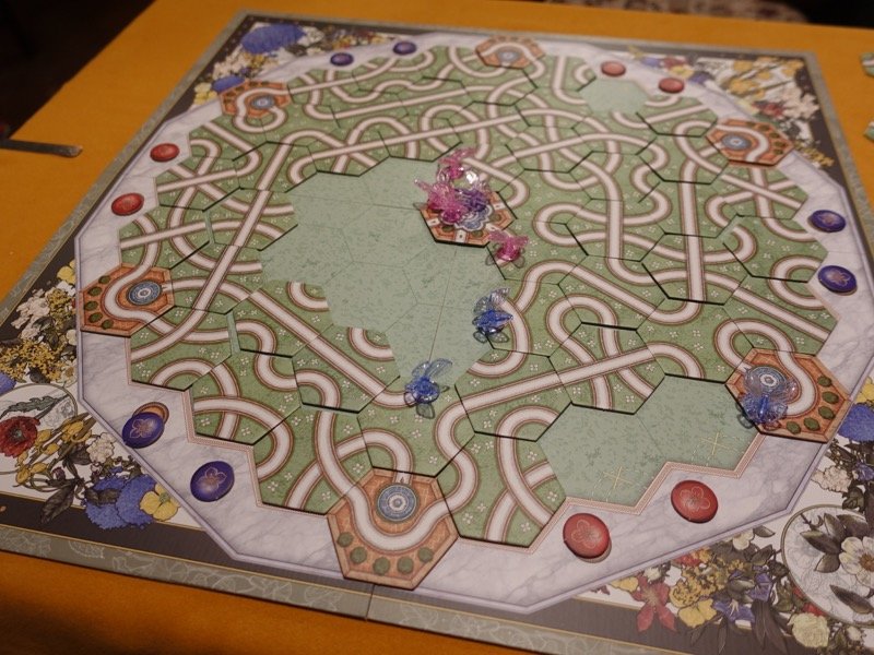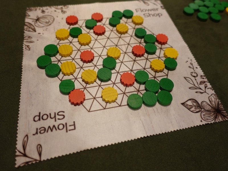 配置制限が厳しく、花は他の花に接したり2コマ以上の茎に接したり出来ません。また異なるプレイヤーの花が同じ茎のグループにつながることもできません。特に花茎茎で三角形に配置できないのが難しいところ。この日遊んだ中ではなかり気に入りました。しのだけさんと2戦し、そのあとスコットさんとも遊びました。今回は小さいボードだったので、次回は大きなボードで遊びたいです。