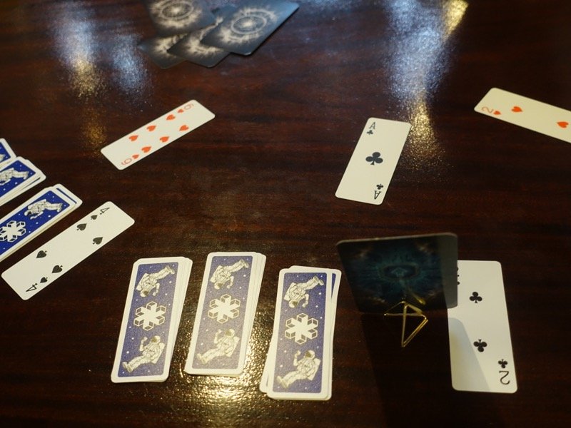 トリックテイクの協力ゲームです。キャプテン以外はとらなければならないトリック数がカードで決められますが、そのカードは本人だけは見ることはできません。なので危ないと思ったら時間を巻き戻してやり直すことができるのです。自分はルールを勘違いしていて、決められたトリック数以下なら良いと思っていましたが、ちょうでないと成功にはならないようですね。ちょっと「ディ・クルー」の簡易版みたいだね、という意見がありました。