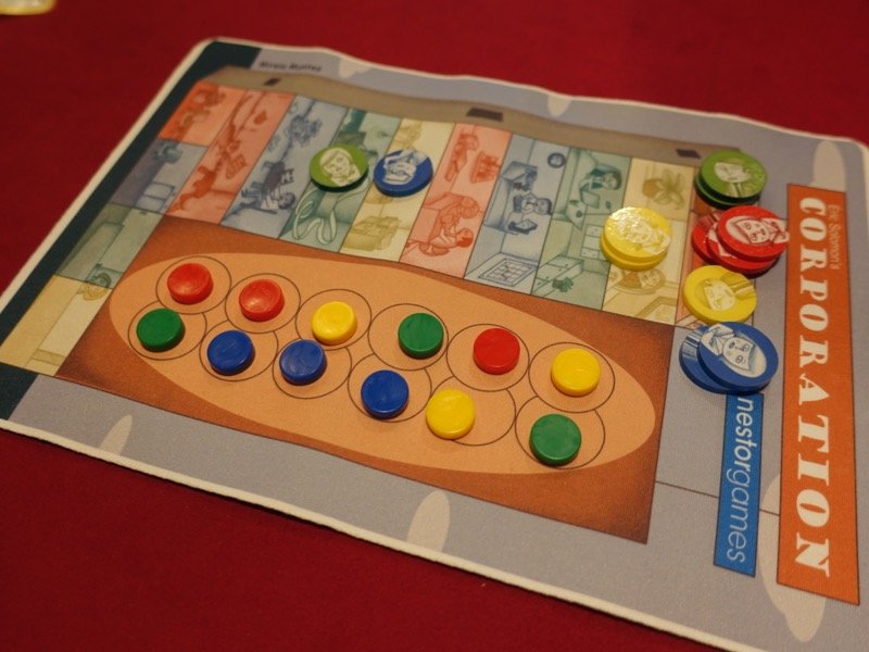 ネスターゲームズから出版された多人数アブストラクトの「コーポレーション」です。手番枚にルールをひとつだけ変えて、そのルールに従ってコマを動かすというシステムは面白いと思います。途中までは良い感じで進んでいたのですが、他のプレイヤーに上に乗られてしまうとどうしようもありません。最後には道化師さんの勝利。