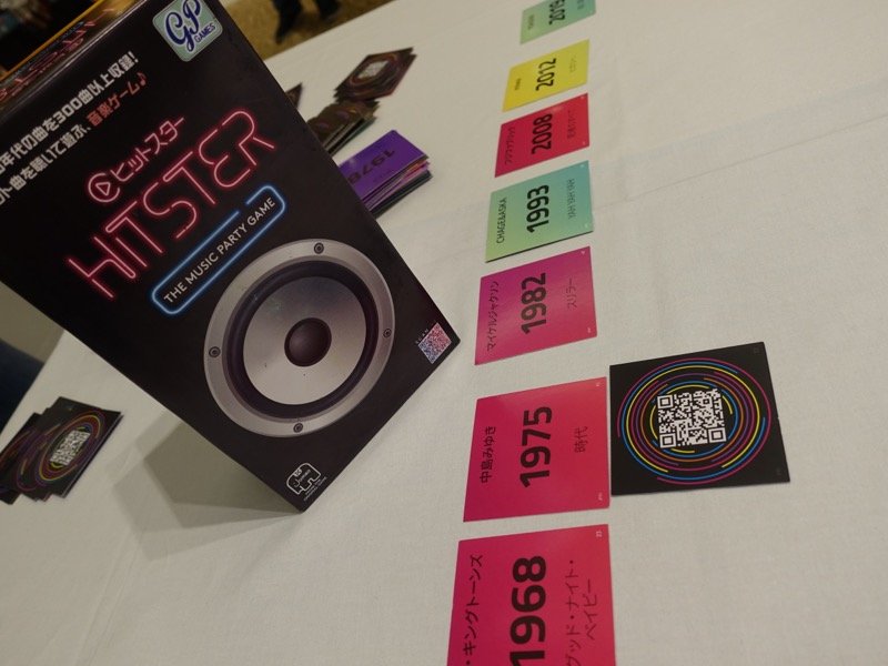 カードの裏がQRコードになっていて、スマートフォンで読み取ると音楽が流れます。その音楽が発表された年を「タイムライン」のように当てていくゲームです。音楽にあまり詳しくないので、自分には難しすぎました。詳しい人同士ならすごく楽しめそうです。