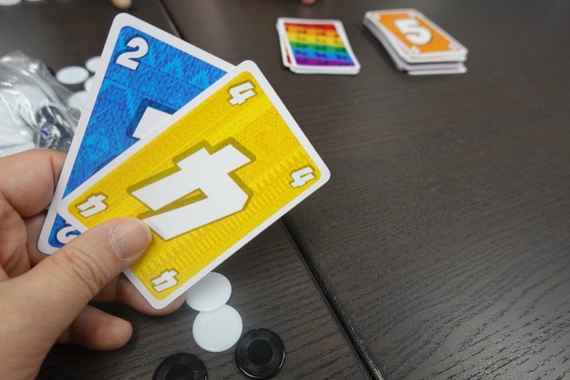 スコットさん持ち込みの「今日からウチの子」です。いつから、赤青黄の今日からうちの子という組み合わせが出せるかの説明がちょっと難しいです。今回は初の6人プレイ。手札は10枚です。6人だと3点先取なので、2ディールであっという間に終わってしまいました。写真撮り忘れ。