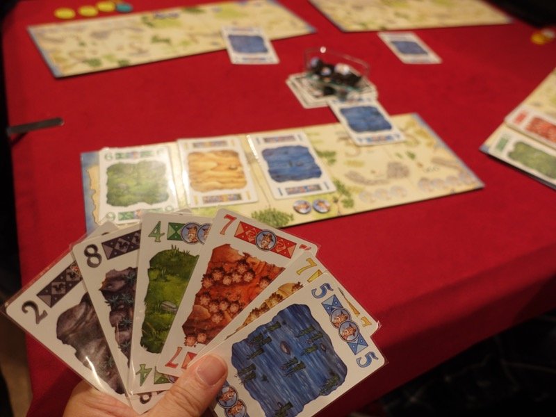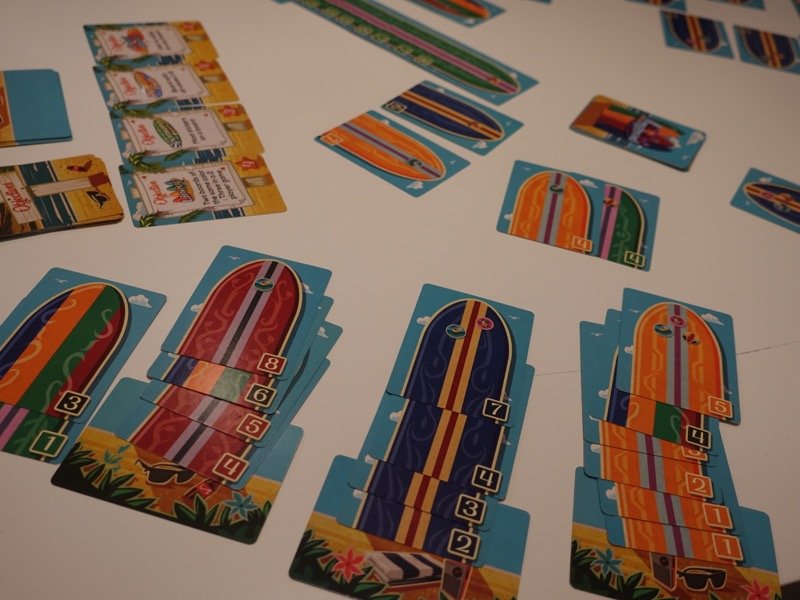 サーフボードをテーマにした、クニツィアらしいカードゲーム。「カステイェールス」のリメイクですが、終了条件やスコアリングは異なります。今回は同じ色のサーフボード2枚という目標があったのですが、それを無視してしまった自分は色々とうまくいかずに最下位でした。なかなか勝てないゲームです。