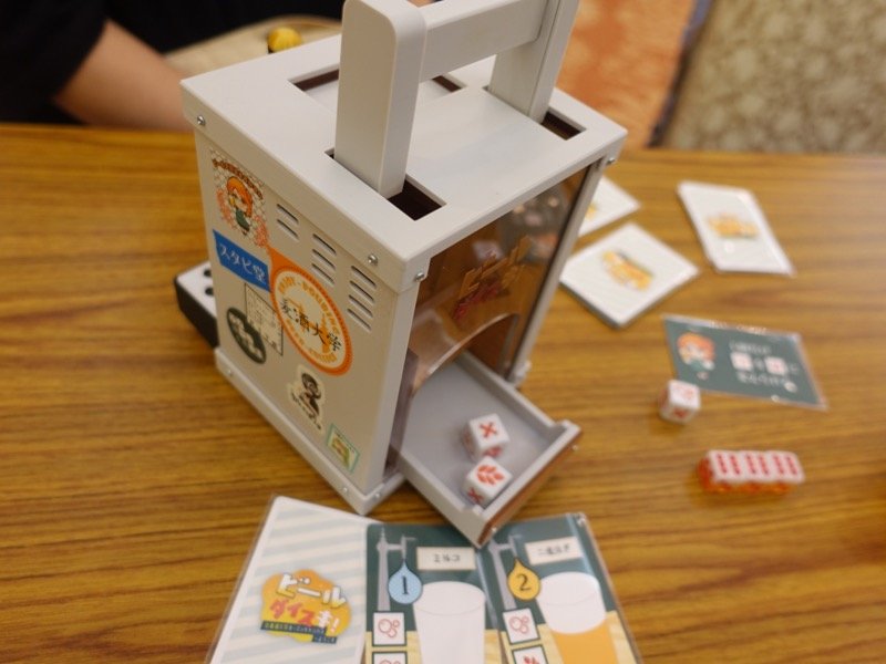 ダイスゲーム。3個のダイスを振って与えられたカードのシンボルに合致するように置いていきます。ちょっと変わっているのはダイスを振る回数が正確に決まっているというところです。3回だと指定されているのに2回で終わらせてはいけないのです。こういう縛りは珍しいかもしれません。写真はビールを注ぐ機会をモチーフにしたダイスを振るギミックで、すごいしっかりした作りです。