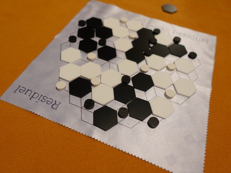 「インディゴ」の韓国版のリメイクです。去年のエッセンシュピールで購入したものですが、遊ぶのは初めて。宝石が蝶のコマになっており、ボードは淡い色で美しいのですが、どちらも視認性は少し悪いかもしれません。2人用のアブストラクト形式で遊ぶようにタイルを半分ずつに分けたところ1枚足りません。最初からないのか欠品なのかはわかりませんが、ちょっとがっかりです。