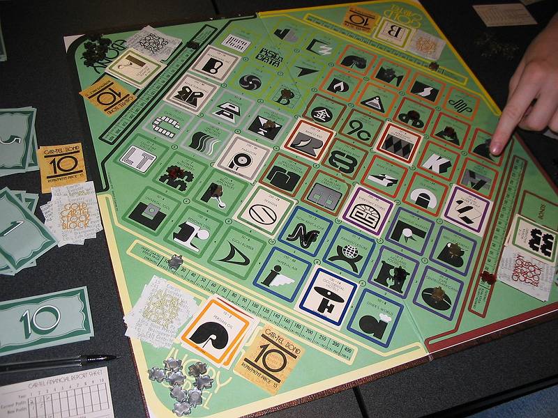このゲームで一番面白いのは支払方法として現金、債権、株券の3種類あって組み合わせられることです。現金が常に少ないシビアなゲームなので、どういう方法で支払うかは大切な選択です。最安値の10の会社以外は債権が用意されており、(といっても数が多くないので早い者勝ちですが) ちょうど半額だけ払えばいいようになっています。ただしゲーム終了時は借りた半額以上を払う上に、会社から得られる利益は永遠に半分となってしまいます。株券は時価で支払いに使うことが出来ます。株券の価値はゲーム開始時は10なのですが、自分のカルテルの収益にしたがってどんどんと価値が上がっていきます。ゲーム終了時にはこれがかなりの額になるので出来れば株は売りたくないのですが債権と違って収益は全額もらえるのでどちらを選ぶか(または両方を組み合わせるか)はかなり悩みます。これらの組み合わせによって、例えば250という高額な会社を買うのに債券で半額の125、さらに時価50の株券2枚と現金25などということが出来ます。