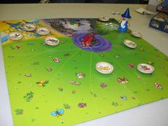 クニツィアのあまり得意でない分野といわれる子供ゲームですが、この水晶を取り戻せはコンポーネントも可愛らしくかつ機能的で、ゲームとしても良く出来ています。プレイヤーは男の子と女の子の2つのコマで水晶を3つ取り戻すことを目指します。基本的には双六なのですが、1が出るとルーレット上の魔女がくるくると周り、魔女に指された子供は蛙にされてしまいます。これがなかなかエキサイティングで子供には大うけ。コースも森の中を通るリスクのある道と平原と2通りあり、また魔法使いを動かして魔法を解くことも出来るなど、細かいところもわかりやすく良く出来ています。大人同士でもドラダなどをプレイする感覚で楽しめると思います。