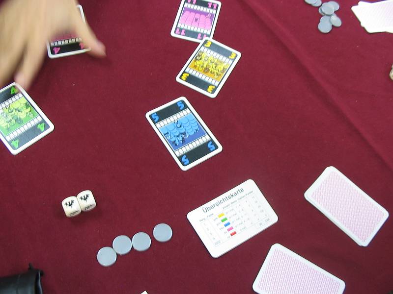 ミクシィで知り合ったRaelさんと初顔合わせ。怪しいトリックテイクのオスカーを教えてもらいました。毎回ディールの始めにさいころを振って、同じマーク(映画のジャンルになっている)が出たもの同士で一定の点数を狙うというゲーム。誰も自分が出したマークが出てないと単独で戦うのでまず勝ち目はありません。ゲームとしてはさいころの運でほぼ決まってしまうような気がします。メンバーが楽しかったので、それでも楽しめました。