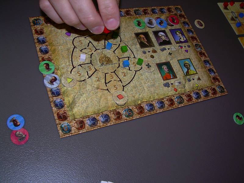 この日プレイしたゲームの中では一番ゲーマーズゲームっぽいです。テーマはエジプトの遺跡発掘で花の形をした博物館内部のボードと8枚から12枚のタイルを並べて作る発掘現場のボードがあります。このタイルが良くできていて、片面は発掘現場となる2x3の6マス分ですが、もう片面は人物カードになっています。