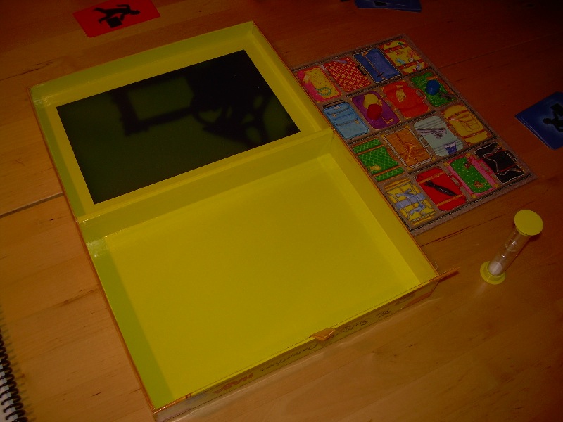 泥棒となったプレイヤーが8つの所持品から2つを極秘裏に盗んで袋に入れます。残りの6つをスーツケースに入れて準備完了。泥棒の左隣のプレイヤーがなるべく判別し易くなるようにスーツケースを振ります。泥棒はスーツケースをオープン。1分くらいだと思いますが、砂時計の砂が落ちるまでスーツケースのブルーの半透明なパネル越しに盗まれた2つを判別するのです。当たればひとつ1点。各プレイヤーが3回泥棒をして合計点を競います。