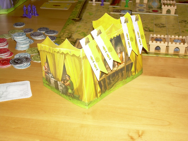 紋章はゲーム終了時にはすべて得点に換算されますが、それ以外にもゲーム中4回換算することができます。自分が沢山集めている色の紋章は、ここぞというときに勝利点に換算しておかないと、後悔することになるでしょう。さらにこの換算は自分の新規労働者獲得と連動しているのも面白い。この「勝利点換算/新規労働者獲得」の回数を表すのが旗のコンポーネントで、これが非常に可愛らしいです。