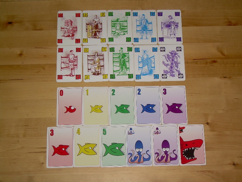 大きな違いは同盟と攻撃の制限です。フィッシュイートフィッシュでは攻撃の前に移動ができ、最終的には1人しか盤上に残りません。カエサルは、移動の概念がなく、離れていても一直線上ならば同盟が組め、攻撃ができます。最後には自分の小さな塔がいかに大きな塔のえじきにならないように安全なところにうまく持っていくという戦略があります。他の大きな違いはカード構成です。フィッシュイートフィッシュでは、あらたに鮫カードが加わり、数値は最大で5までになっています。さらに塔の高さも5が最大なので、プレイしやすいかもしれません。