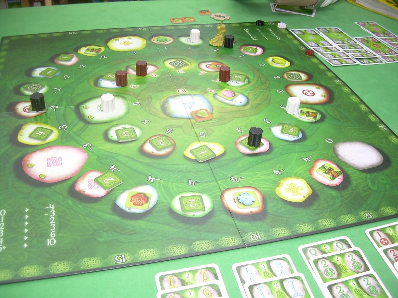 初プレイのケルトスパイラル。カードはケルトと同じ110枚ですが、それぞれのカードには通常の数値の他、巫女が進める数字(1ー5)も書かれています。ボードは一本道で中央までスパイラル状になっており、出したカードに対応した色の次のマスに進みます。願いの石のマスはその直前も同じ色になっていたりと意地悪にできており、考えられています。タイルには、ケルト同様に得点になるもののほか、次の指定された色のマスまで進めるもの、任意のマス目まで戻れるもの、自分の手札あるいは場札の列の最後の1枚を捨てられるもの、などがあり、とくに任意のマス目まで戻れるものをうまく使って願いの石を手に入れることが大切です。他にも願いの石の得点が2倍3倍になる鏡タイルなどもあり、考える要素が増えています。また、自分のコマの代わりに巫女を動かすこともでき、巫女を自分のいるマスに誘導すると5点もらえます。これは強力なのですが、自分のコマが動かないのであまり巫女にとらわれていると勝てません。今回は大敗しましたが、巫女の誘惑に負けたのが原因でしょう。