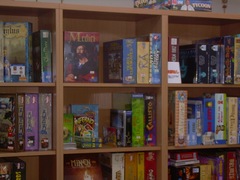 以前のネット販売のときから厳選したセレクションで、ゲームソムリエのタナカマさんらしさが伺えましたが、この実店舗も同様にこだわりが見られる品揃えです。また、すべて木製の棚を使っていてなかなか落ち着いた雰囲気です。中央には大きなテーブルもあり、ここで実際に遊ぶことも出来るようになっています。小さいながらもクニツィアコーナー(写真)があるのが、ファンとしては嬉しいところ。暫く店舗を見学させてもらってから、タナカマさんの奥さん(アッキーさん)と3人でゲームを楽しみました。