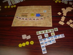 最後に、一緒にチグリスユーフラテスを遊んだKIさんと、TGF以来のMerryniceさんとでラーを遊びました。持参したプロトタイプ版です。やはりラーは3人がゲーム性の上ではベストだと思います。今回はモニュメントとファラオでせめて行きましたが、最後にモニュメントの8つめも同種の3つめも揃わずに3点差でKIさんの勝利でした(写真はゲーム終了時のもの)。