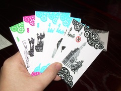 神経衰弱(メモリー)に競りの要素を加えたゲーム。のちに「ソクラテス」としてリメイクされていました。同じ数値か同じ色をめくり続けている限り大丈夫ですが、どこまでめくれるかをめくった数値の合計でビッドしていくのです。ビッドに勝ったプレイヤーは少なくとも宣言した数値に達するまでカードをめくりますが、失敗するとそれまでに取った自分のカードを1枚返却しなければなりません。