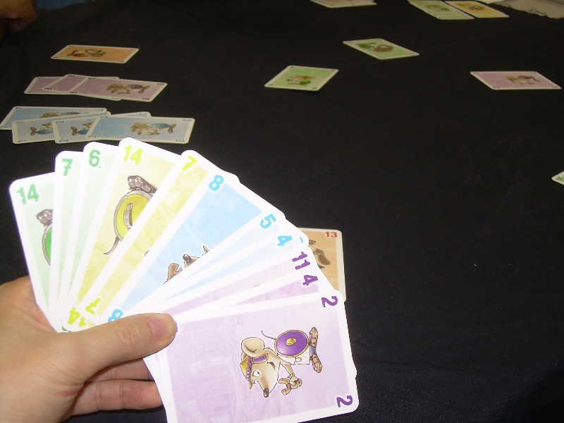 15点先取で、得点としてメルドできるのは自分が手番になったときの開始時だけです。よって後半はメルド権を得るために競りに勝たなければならないのです。不思議なプレイ感覚で、カードでカードを競る所や後半のメルド権の獲得などはカッツェンジャマーブルースっぽいです。草場さんによれば、3人よりはもっと大人数が良いとのことなので、また機会を見て遊んでみたいです。