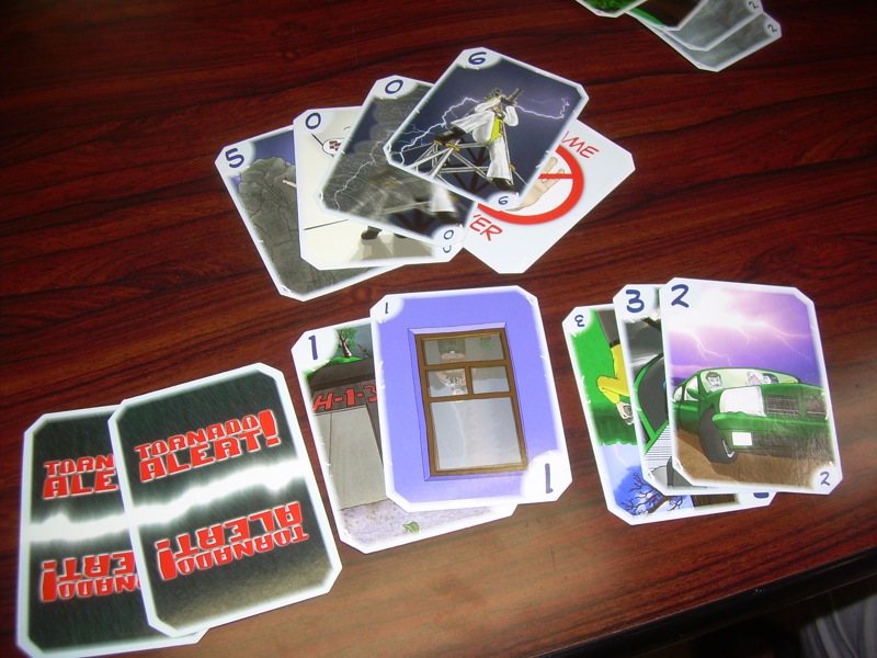 タイトル通り、竜巻カードというお邪魔カードがかなり入っています。それぞれには得点カードに対応した絵が描かれており、竜巻カードが出されると、得点パイルの一番上が同じ絵のプレイヤーはそのカードを裏返して0点扱いとします。また同じカードが2枚プレイされると落雷が起こったことなり、得点パイルの一番上が同じ絵のプレイヤーは自分のスコアリングで一番低いものを裏返して0点扱いにします。他に裏返したカードを表にしてくれる天才カードや平均点にプラスマイナス1点を与えるカードなどいろいろな特殊カードがあります。