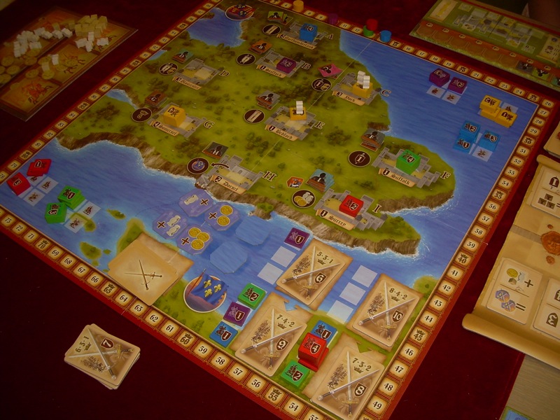 フランスとの戦争は2枚のカードで表され、それぞれ3カ所騎士を置く場所があります。国と違って追い出すことや従者を使うことはできませんが、自分が既に置いた騎士の上に重ねて追加で置くことができます。置くたびにリソースがもらえる特殊タイルが選択できます。戦争は必要な兵力が書かれており、合計が達していれば最も兵力の大きいプレイヤーから1位、2位、3位の勝利点がもらえますが、達していなければ1位は2位の、2位は3位の勝利点を得て次のラウンドまで戦争保留となります。次のラウンドで再び同様に解決するので、戦争に行って負けるデメリットはそれほど大きくはありませんが、2度連続で負けるとコインを兵力分だけ払わない限り騎士が没収されます。また騎士の兵力が同じときには後から置いたプレイヤーが勝つというちょっと変わったタイブレークですが、先に置けば特殊効果タイルの良いものが取れることでバランスを取っています。