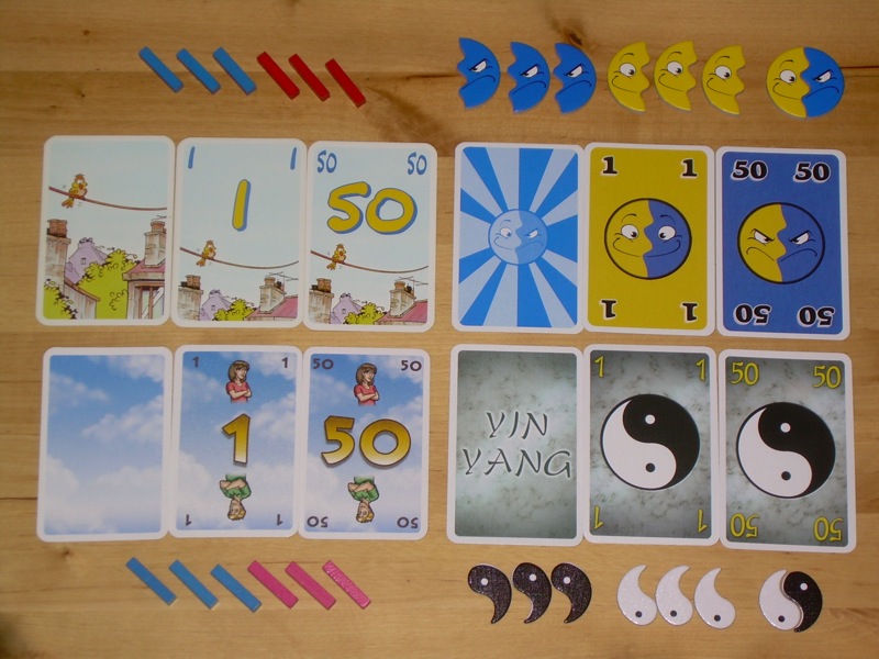 リメイクの「カップル危機一髪」はテーマこそ綱渡りから恋人関係の綱渡りへと変更になったものの、ルール的には「綱渡り」と同じです。喜怒哀楽をテーマにした「フィフティフィフティ」や中国の思想をモチーフにした「陰陽」では得点表示カードが大きく異なり、特殊カードは無く、単純に10枚中9枚を使うようになっています。その10枚は、2種類の得点が異なり、1-4、2-5、3-5、3-6、4-7という組み合わせと、それぞれの逆というようになっています。3-5と5-3以外は差が3なのですが、これらを加えることにより、それぞれの種類で1、2、3、3、4、4、5、5、6、7という中央に厚みのある得点分布となっているのです。10枚全体では得点の総和は等しいのですが、9枚しか使わない為に必ず全体としても2点か3点の差ができるというアンバランスさを自然に生み出しています。どちらが良いかは好みにもよりますが、カウンティングがしやすい「綱渡り」「カップル危機一髪」の方が個人的には好みです。他にも0点に抑えたときの特典やバリアントなどが微妙に異なり興味深いです。