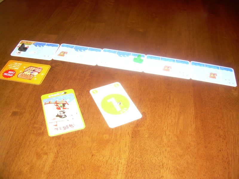 持参した中からトムがまず興味を示したのがこのババ抜きレースゲーム。引き運が悪く、爆弾ばかり引いていて7マスしか進めませんでした。このシステムは中量級のゲームに応用できるような気もします。多人数バージョンとかあったら面白いかもしれません。