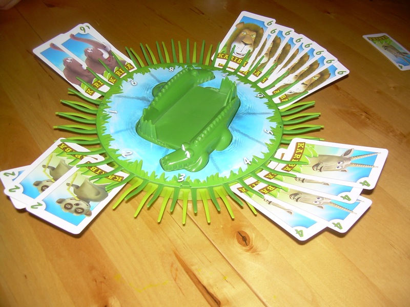 プラスチック製のボードが目を引きますが、クニツィアらしいカードゲームです。ボードの中央はカード置き場で、周囲の草にカードを差し込むようになっています。カードは1から9まで8枚ずつ計72枚あり、手番には5枚の手札から同数値のカードを好きな枚数場に出します(カード置き場に差し込みます)。この結果、出した数字のカードが合計で3枚以上になったら、それより1つ下の数字のカードをすべて取るのです。なお最小の1は最大の9を取れます。常に5枚になるよう補充し、山札も手札が無くなった時点で最も多くカードを取ったプレイヤーの勝ちとなります。