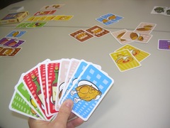 ムーンのカードゲームでは割と面白かったという印象がある「キングルイ」を久し振りに遊びました。JOSSさん持ち込みのオランダ版の「Foodie」です。7種類15枚ずつの食べ物カードと5枚のエメラルドカードをよく混ぜて山札とします。目的は多くの食べ物を獲得することです。それぞれの種類で、王様が獲得した枚数と自分が獲得した枚数の積が得点となりますが、王様より多く獲得すると無礼者!ということで、0点になってしまいます。各ラウンドではプレイヤー人数の2倍を山札から表向きに公開します。手番は、1種類の食べ物カードすべてを取る、山札から1枚取る、場のエメラルドカードを使う、の3通りがあり、全員が1回ずつ手番を行ったところで残ったカードは王様のものになるわけです。これをカードが足らなくなるまで繰り返してゲーム終了です。