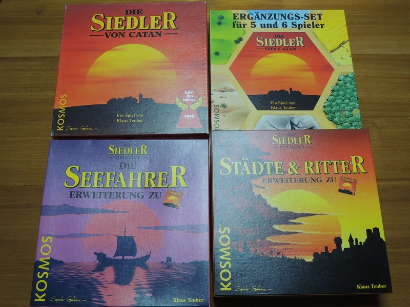 ドイツゲームの代表作として突出した人気を誇るゲームです。1995年にトイバーがコスモスから出版したゲームで、初版は赤い夕日が非常に印象的な箱でした。当時は「カタンの開拓」という邦題が付いていました。その後、アメリカからのメイフェア版を始め、世界中から何度も再販されています。日本語版はトライソフト版、カプコン版、そしてジーピー版があります。単に「カタン」と略されることも多く、英語圏では Settlers、ドイツ語圏では Siedler と略されるようです。拡張やスピンオフも実に多く、思いつくものだけでも「航海者たち(海カタン)」「騎士と古城(騎士カタン)」「シナリオ集1-3」「ニュルンベルグカタン」「カタンブック」「カタンカードゲーム」「3Dカタン」「カンダミール」「エラズンド」などがあります。これだけ続編が出るというのは元のゲームがしっかりしている証でもあります。メカニクスから見ても、可変ボード、ダイスロール、建設による陣取り、拡大最生産、交渉とセットコレクション、バースト、特殊カードの能力、と近年のドイツゲームの基礎となった様々な要素が含まれています。
