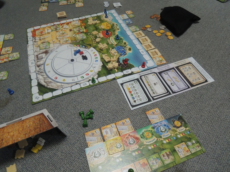最近色々なところに持ち込んでいる「自由都市」です。途中までなるおさんが真ん中の建物に固執しているようだったので、より多くのミープルを持っている道化師さんをターゲットにしていたのがまずかったみたいです。再配置の能力であっという間になるおさんに最多を様々なところで勝ち取られて負けてしまいました。これは自分のミスです。道化師さんすみません。