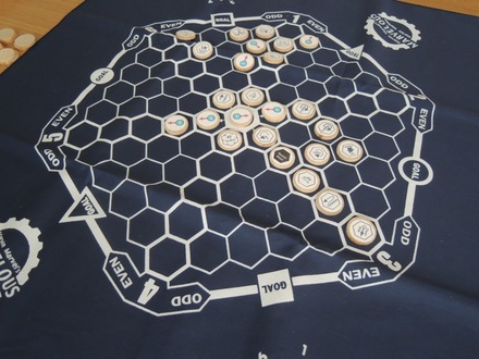 ヘックスヘックスボードの一辺が自分の辺となり、そこにできるだけ多くのマーブルを誘導するというゲームです。マーブルは常にボード中央のホームから現れ、一定方向に一定のマス数(1−4マス)進みます。それらのマーブルの進路を変えるべく、さまざまなマシンパーツと呼ばれるチップを盤上に置いていくのです。マシンパーツには、進行方向を変えるもの、ある方向に押すもの、ジャンプさせるもの、ランダムに方向を変えるもの、単なる壁、などさまざまなものがあります。またパーツを移動したり除去するものまであるのです。