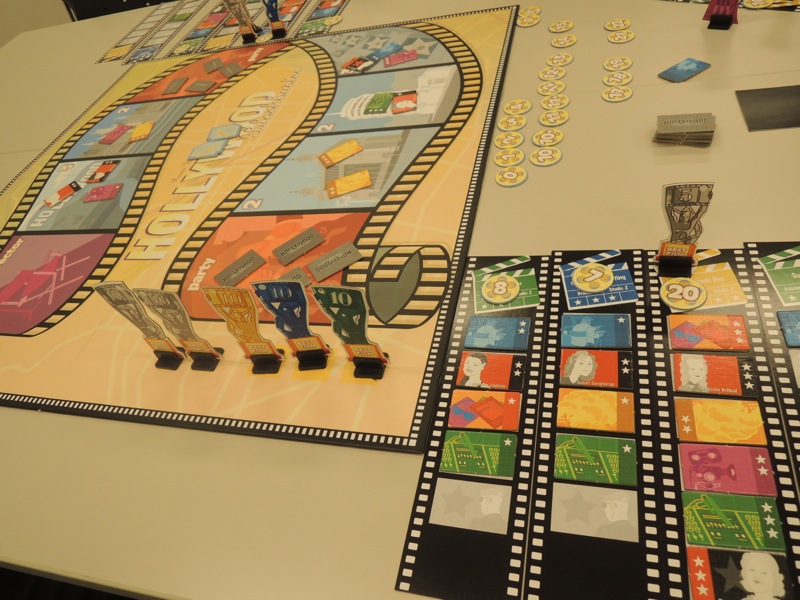 「ハリウッド」のウーバープレイ版で俳優名がすべてパロディーなのを楽しむゲームです。シダマさんがこのゲームが好きだということで4人で遊ぶことになりました。ちょっと勝負に出るのが遅過ぎてしまい、ひとつも最初の映画の賞は取れませんでした。最高の20点の映画を作るものの、追いつかれそうでヒヤヒヤ。最後は緑の分野でおかえりさんよりひとつだけ星が多い映画を作ってトップになる予定でしたが、おかえりさんが自分以上に契約書を溜め込んでいて大失敗です。それにしてもテーマに合っていて良いゲームですね。今度はフィロソフィア版の「ドリームファクトリー」を遊んでみたいです。