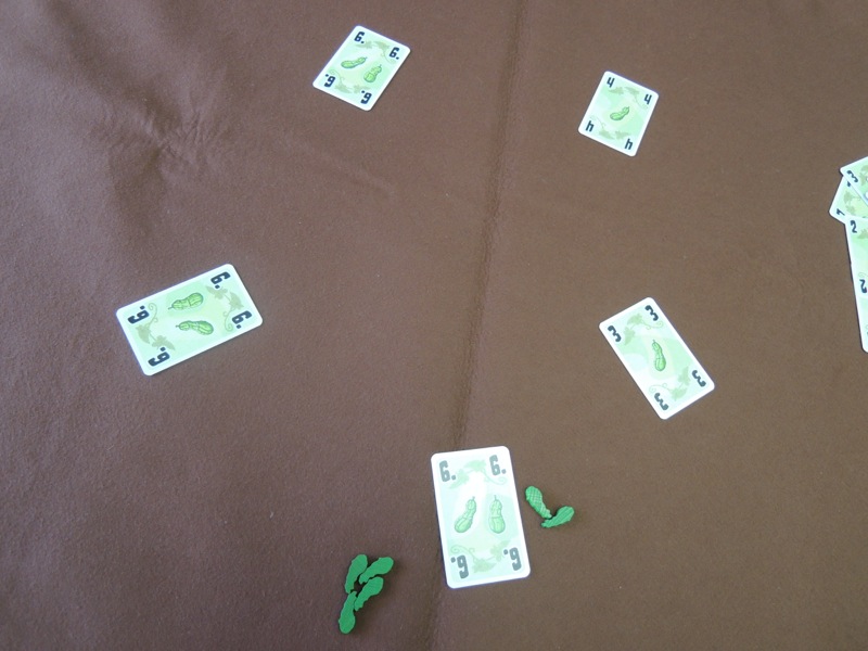 時間調整もかねて五本のきゅうりを遊びました。今回は4ディールで終了です。すでに4個のきゅうりを持っていたのですが、最後に3人が6を出して手番順できゅうりを喰らってしまい敗北です(写真)。