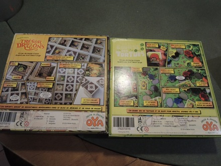 スーツケースを夜行列車の出るオステルリッツ駅に預けて、近くのカフェでグランマニエのクレープを食べたあと、記憶を頼りに徒歩でイタリー広場 Place d'Italie へ。そこからLes GobelinsにあるOYAゲームズに向かいます。3度目の訪問なので店主のパトリックさんはさすがに覚えていてくれて「エッセンはどうだった? クニツィアの新しいゲームはこういうのがあるよ」と色々と見せてくれました。特に「ドラゴンの宝物」と「かめのかけっこ」はフランス版では箱の裏に漫画でルールが書かれており、また中に入っているルールも上箱の裏側に貼付けられるように箱より一回り小さい紙の表だけになっています。これは学校などがゲームを買うときに、箱の裏にルールを貼り、ルールをなくしたりしないようにとの配慮です。もちろん1ページのルールなので文字だけなのですが、図や例は箱の裏の漫画を見れば良いということなのです。素晴らしいですね。