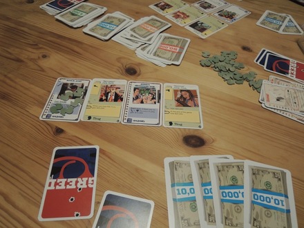 引っ越しの箱の中身を売るというTV番組を元にした純粋な競りゲームです。事前に競る内容を幾つか見ることができるのが面白いところです。競りは公開競りとブラインドビッドの2種類でオークショナーが任意に選べます。パッケージもコンパクトで可愛らしく、好感が持てます。なかなか面白かったので、同行した神尾さんとひとつずつ買いました。