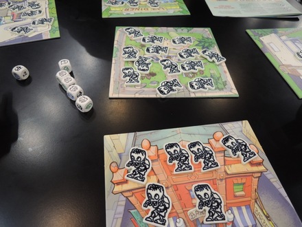 ダイスを振って自分のボードのゾンビを無くすという単純なゲームです。ダイスはすべて同じで、墓、ゾンビA、ゾンビB、ゾンビペア、x2、家、という6面です。何度でも振り直せますが、必ずゾンビを1つは新たに固定させなければなりません。固定させたダイスは振り直せません。またダイスは2つがペアでないと機能しません。自発的に止めたときに、墓のペアがあればゾンビのペアの分だけゾンビを取り除けます。家のペアがあると他人に押し付けられます。ドイツ人の3人のグループに混ぜてもらって4人で遊びました。手軽ですがなかなか盛り上がりました。