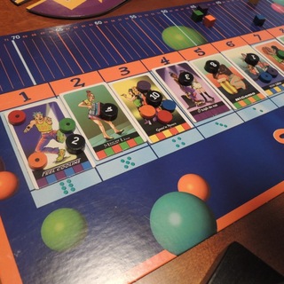 次は音楽業界のチャートでのランキングをテーマにしたゲーム「シュリレシュテレ」です。木製のCDプレイヤーと呼ばれるギミックがかなり凝っていますが、同時ビッドをしつつ誰がどのビッドをしたかが分からないようになっており、機能的です。各プレイヤーは、毎ラウンド自分のレーベルをヒットチャートの上に押し上げるために、そして1位や赤丸急上昇のアーティストを予想するために自分のCDに木製チップをビッドしていきます。このCDがプレイヤーにセットされて、14位から順に発表していくというわけです。このときCDを抜くにはちょっとコツがいるので、練習が必要かもしれません。